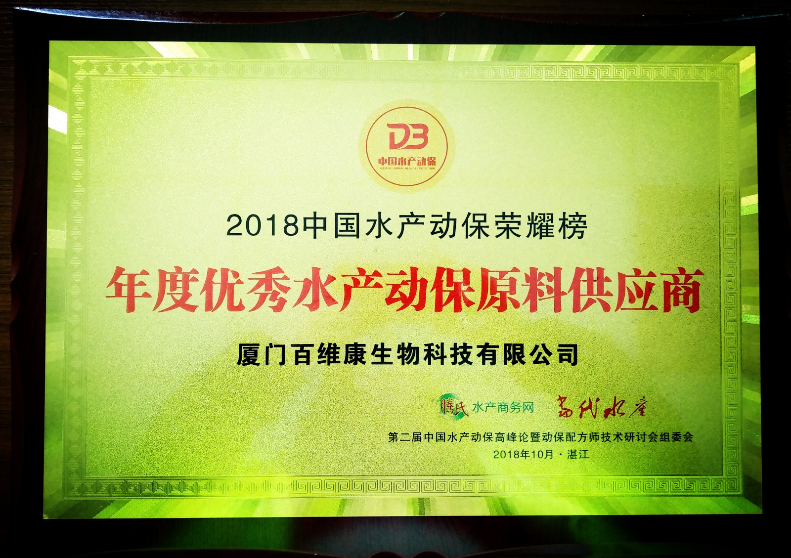 2018年10月20日“廈門(mén)百維康生物科技有限公司”在第二屆中國(guó)水產(chǎn)動(dòng)保高峰論壇暨動(dòng)保配方師技術(shù)研討會(huì)上榮膺《年度優(yōu)秀水產(chǎn)動(dòng)保原料供應(yīng)商》殊榮;熱烈慶祝百維康總經(jīng)理王曉林先生斬獲《年度優(yōu)秀水產(chǎn)動(dòng)保配方師》殊榮。